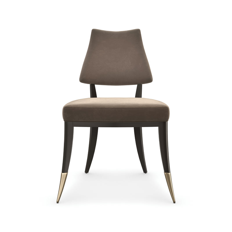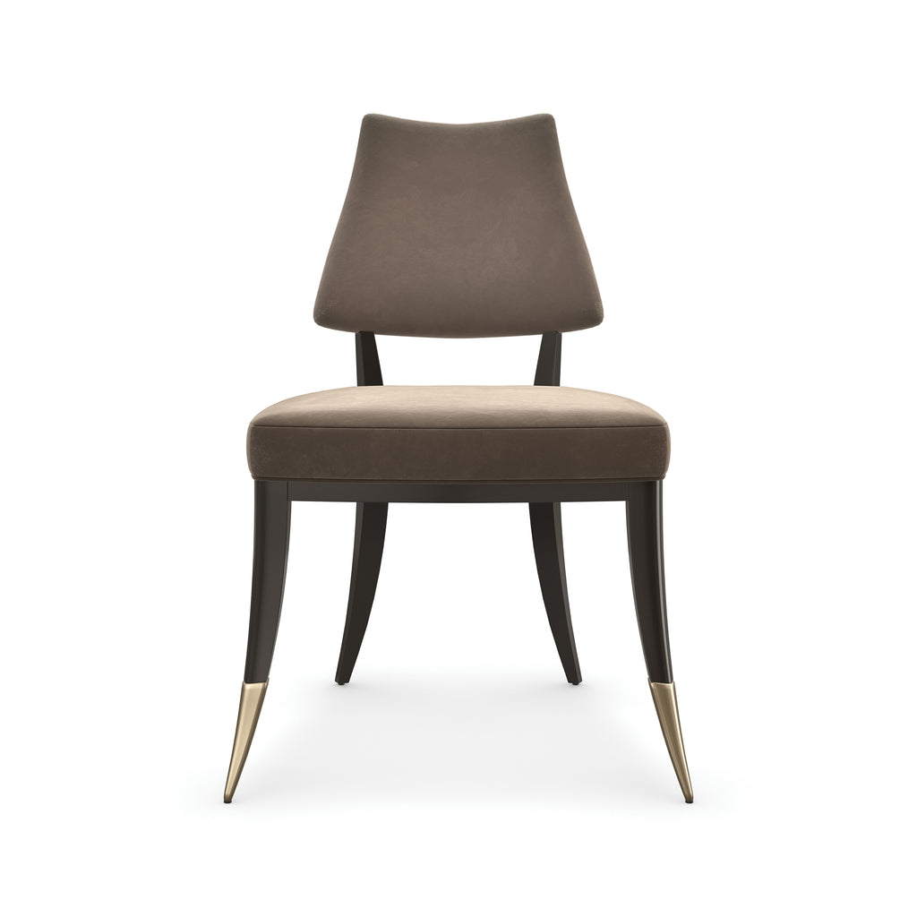 A petite and soulful silhouette reminiscent of a French antique, the Caress Dining Chair from Caracole is designed for lingering conversations around the table. This elegant chair is defined by its soft, sculpted back and a plush seat, impeccably dressed in a smoky taupe velvet. The timeless form is complemented by tall, tapered legs with a gentle outward curve, each finished with a luxe, Brushed Gold metal ferrule. A fusion of classic inspiration and modern refinement, it brings a touch of quiet, understated glamour to any dining experience.