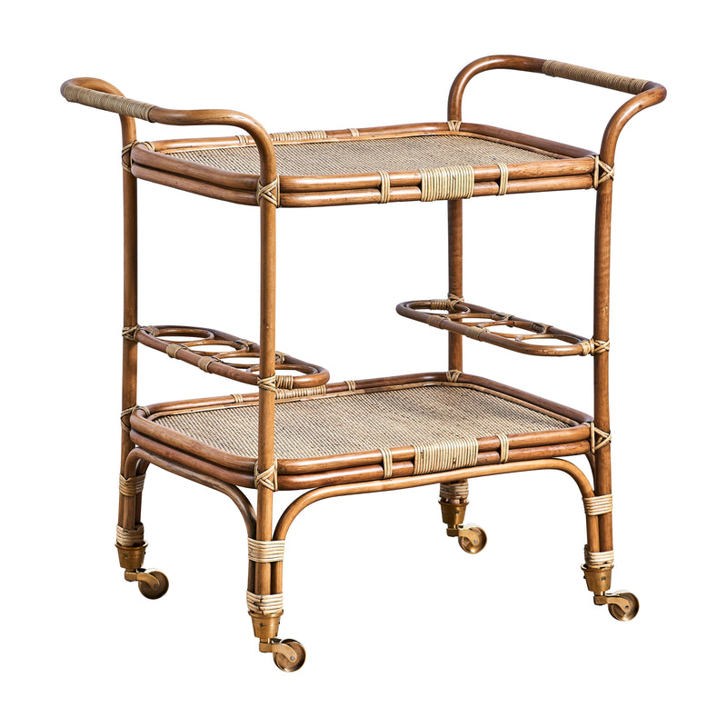Bringing back the glamour of the 1950s and 1960s, when dinner parties and merry mixers were all the rage, the Carlo Bar Cart/Trolley from Sika Design is an elegant, yet rustic addition to your well-appointed home. Handmade from lightweight, durable Rattan, this two-tiered bar trolley showcases two woven shelfs, caned bottle racks and brass finished castors for a touch of glamor. Over time, the natural rattan weathers to a silvery patina, adding to the vintage vibe of your home bar.