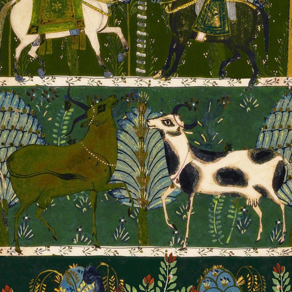 Embrace the CARNAVAL spirit with horses, cattle and elephants adorned with decorative garlands and embroidered tapestries. Lose yourself amongst exotic foliage and vivid florals while the sound of music fills the air which even the animals are dancing to. The vibrant color combinations across the print bring it to life, bordered by tasseled, golden garlands which allow the eye and mind to transition between the settings, imagining the different scents which encapsulate you, as you wander through the magical gardens in each scene.