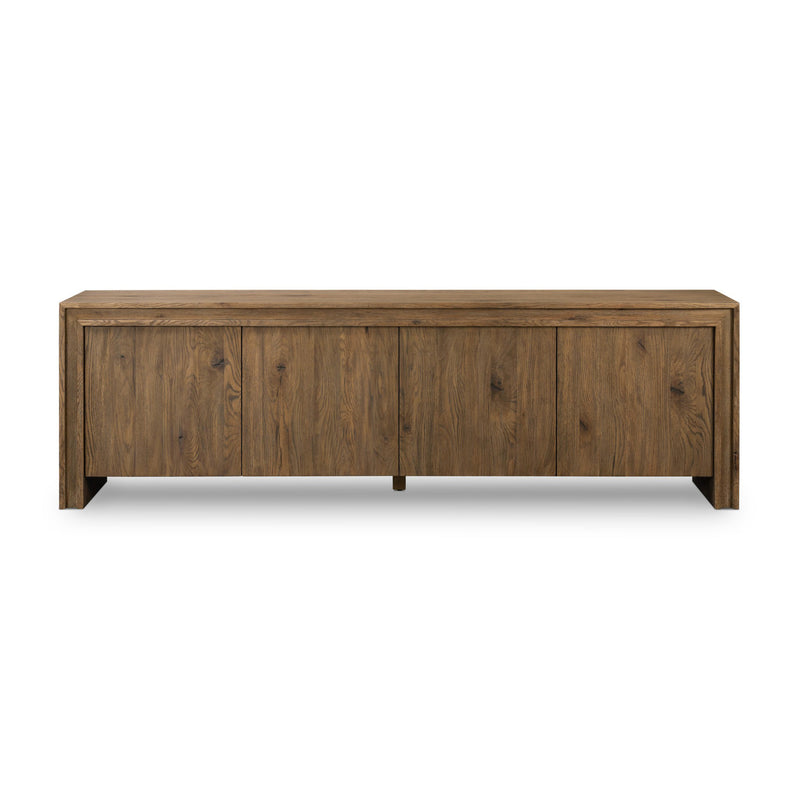 Bring a grounded, organic presence to your entertainment space with the Chalmers Media Console from Four Hands. Showcasing the robust beauty of solid oak and thick veneers, this piece features a wide frame accented by clever relief detailing and a warm, weathered finish. The hardware-free design utilizes push-latch doors for a seamless look, blending sturdy craftsmanship with a clean, modern aesthetic.