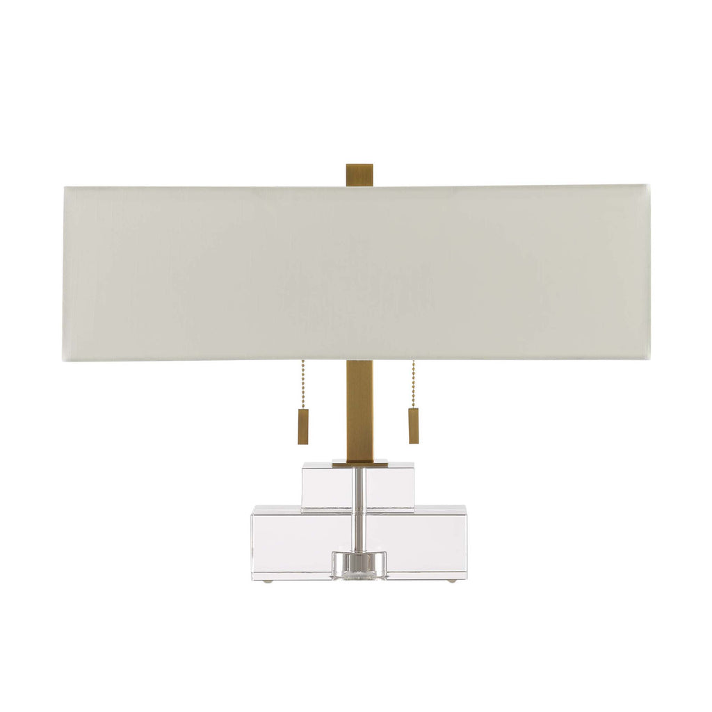 The Chiara Table Lamp from Currey & Company dazzles with clear optic crystal rectangles that create a luminous glow. Its pale stacked body is elegantly contrasted by antique brass metal accents and an off-white shantung shade, making it a sophisticated and striking addition that enhances any room’s ambiance.
