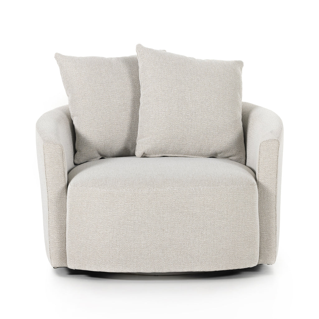 Great solo or paired up. Smooth curves finished with warm boucle upholstery. Throw pillows present an added touch of comfort to this sensibly styled swivel chair. Performance fabrics are specially created to withstand spills, stains, high traffic and wear, ensuring long-term comfort and unmatched durability.