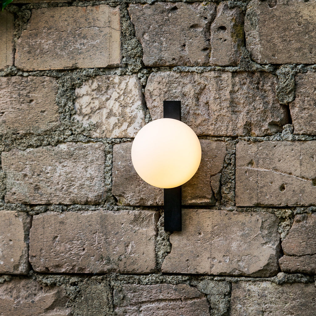 Sconce globe balanced on a metal bar. Suitable for outdoors, making the Circ A-3720X Wall Sconce ideal to illuminate walkways and terraces.