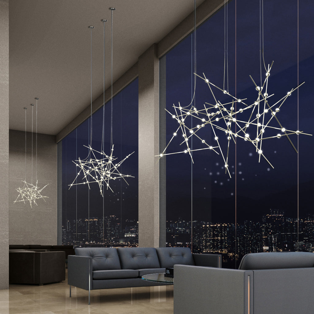 Transform your space into a celestial wonderland with the Constellation Ursa Major Chandelier from Sonneman. This avant-garde chandelier features a chaotic cloud of Satin Nickel rods and dimmable integrated LEDs that shine like distant stars. The result is a massive, all-encompassing light that will bring the beauty of the night sky indoors.