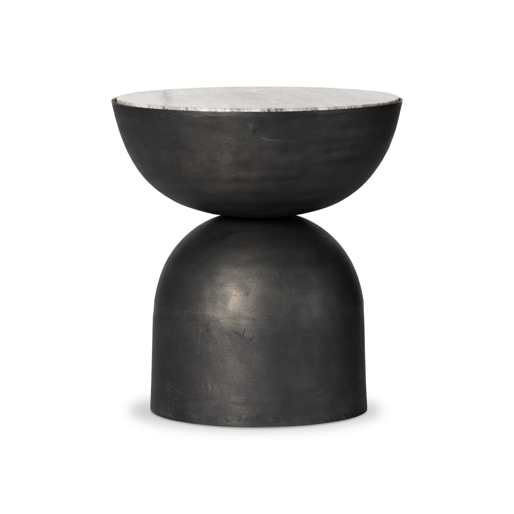 A sculptural play on shape. Hammered grey-finished aluminum base supports a rounded tabletop of grey or creamy taupe marble with natural veining.