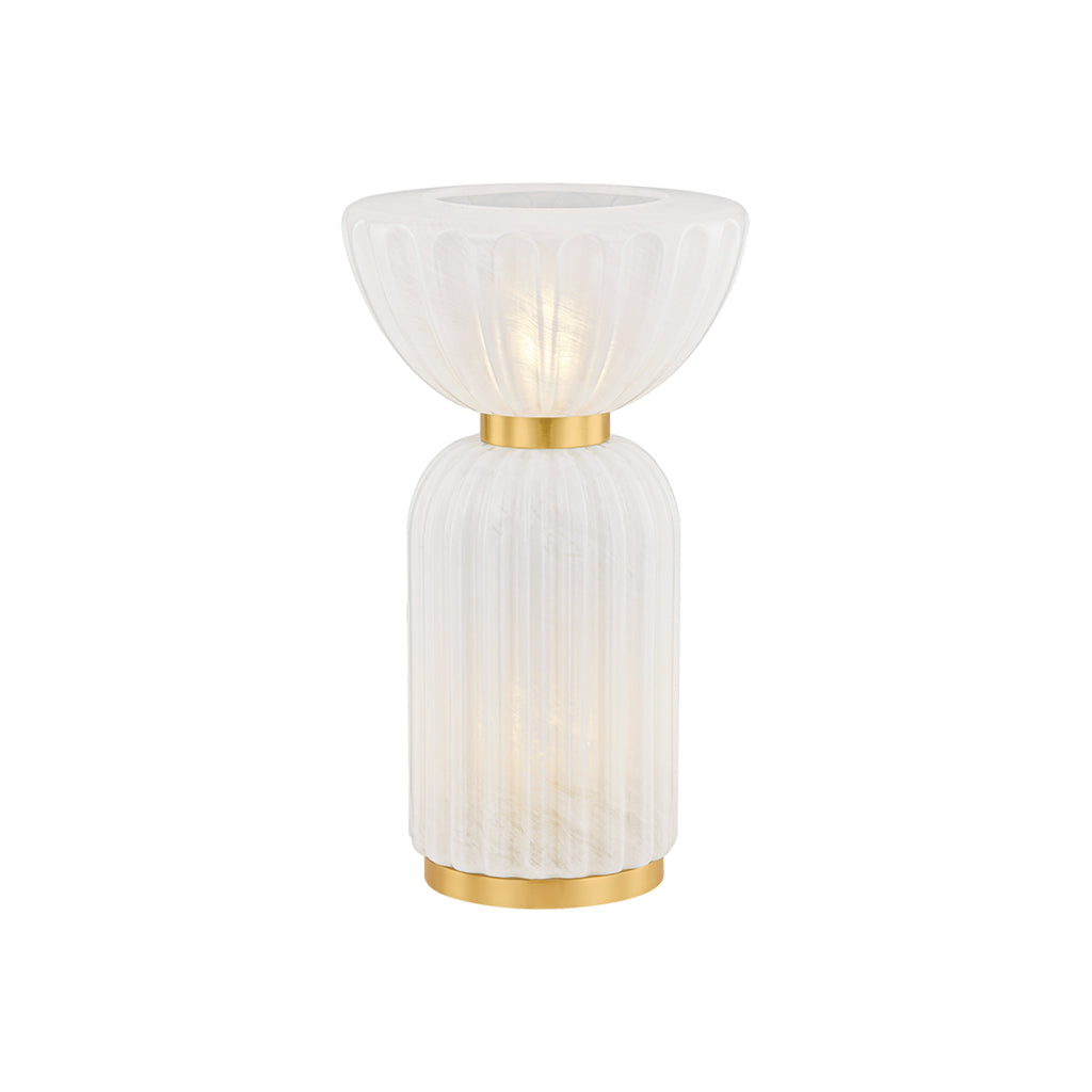 Introduce a touch of neoclassical elegance with the Cordelia Table Lamp from Mitzi by Hudson Valley. The fluted, cloud glass base and opulent, upturned dome shade exude timeless sophistication. The Aged Brass cuffs add a vintage touch, while the all-over glow illuminates any space with a contemporary statement.