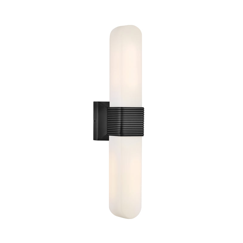 Modern with a rounded, elongated silhouette, Cotes’ integrated LED design paired with Etched Opal glass is accentuated by a ribbed collar in a Lacquered Brass or Painted Black Oxide finish. The curved glass juxtaposed against square details offers a soft balance of shapes that is elegant yet versatile enough to complement any bathroom or living space.