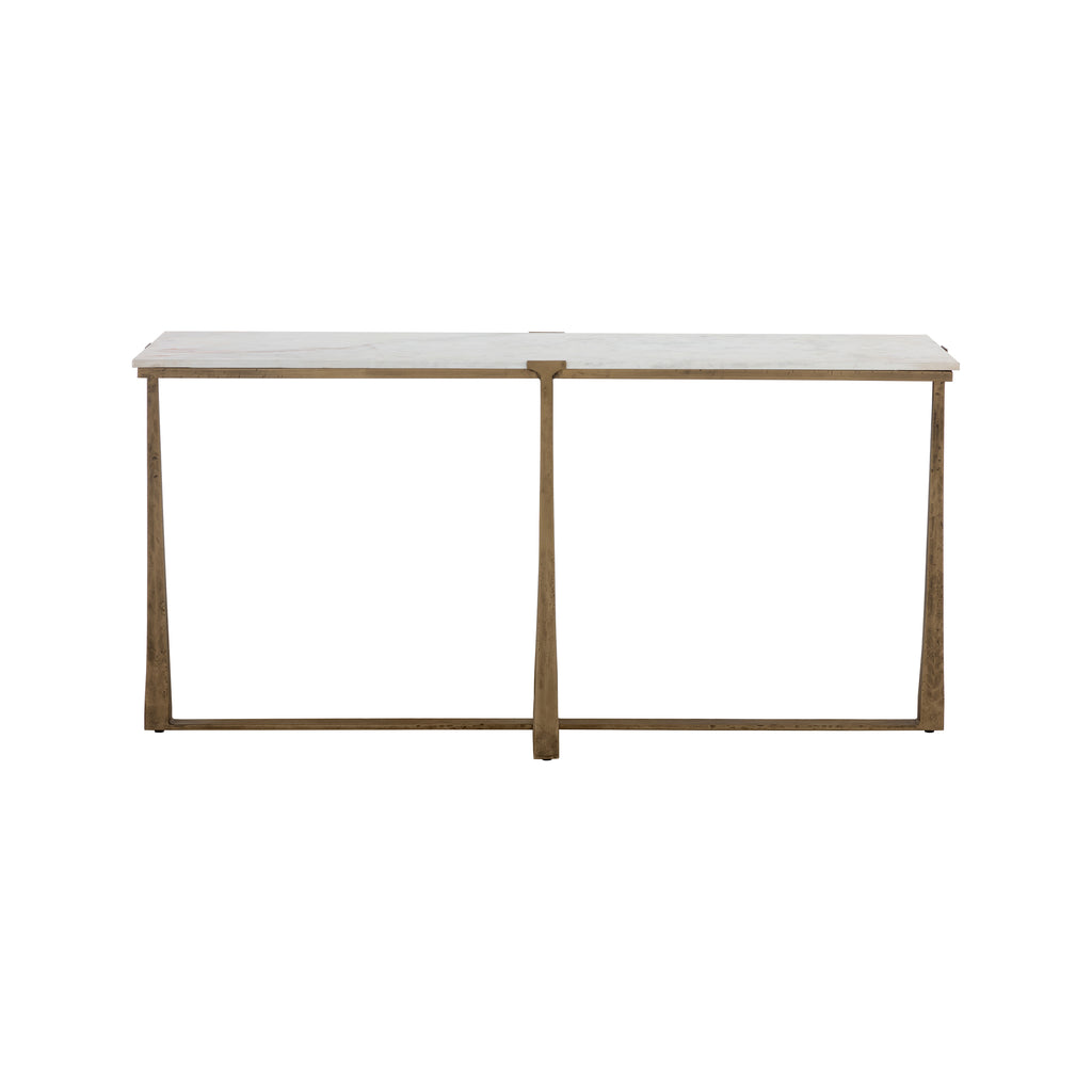 Experience the timeless allure of the Cowell Console Table from Sunpan. Inspired by mid-century design. this console table features a chic, minimalist aesthetic with powder-coated antique brass legs and a cool white marble top with unique natural markings. Handcrafted by skilled artisans, each piece is truly one-of-a-kind, ready to elevate your space with refined elegance and rustic charm.