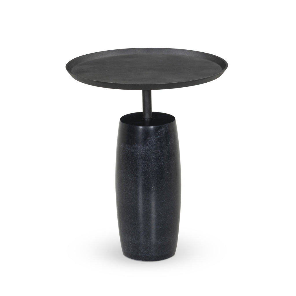 The Cronos End Table from Four Hands embodies refined material dialogue through its architectural composition. A meticulously turned marble base in polished black provides a substantial foundation of natural elegance, while the hammered grey aluminum tabletop introduces textural sophistication through its tray-inspired form. This thoughtful juxtaposition of materials—the enduring permanence of stone against the subtle luminosity of worked metal—creates visual intrigue through surface variation and reflective qualities.