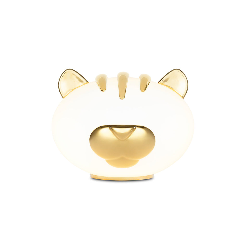 Unleash your wild side with the CU Pet Light - Grwoww from Moooi. Designed by Marcel Wanders and hand-blown in the Netherlands, this lamp boasts a playful tiger-inspired design with gold-covered ceramic details. With a cord switch and dimmer, it emits a warm, indirect glow, adding a whimsical, yet elegant touch to any room.