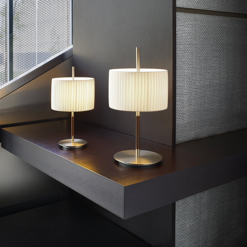 Table lamp with iron structure available in satin nickel and nickel with dark leather trim finishing. Lampshade available in cotton and white or cream translucent polyester blend hand wrapped ribbon. Includes a polycarbonate diffuser.