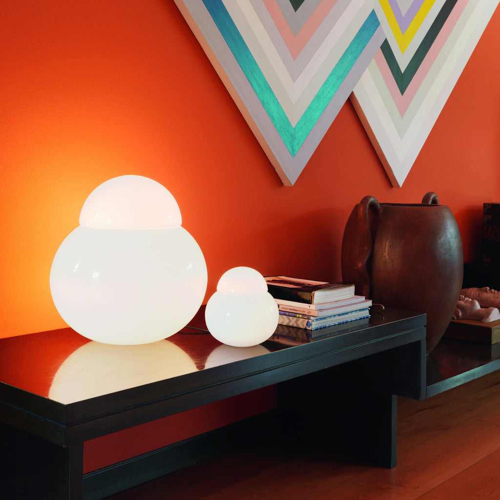 On show at the Museum of Modern Art in New York, Daruma was produced in 1968 to a design by Sergio Asti. Comprising two diffuser elements in glossy white blown glass, this table lamp has simple, formal features: a spherical vase topped by a little lid.