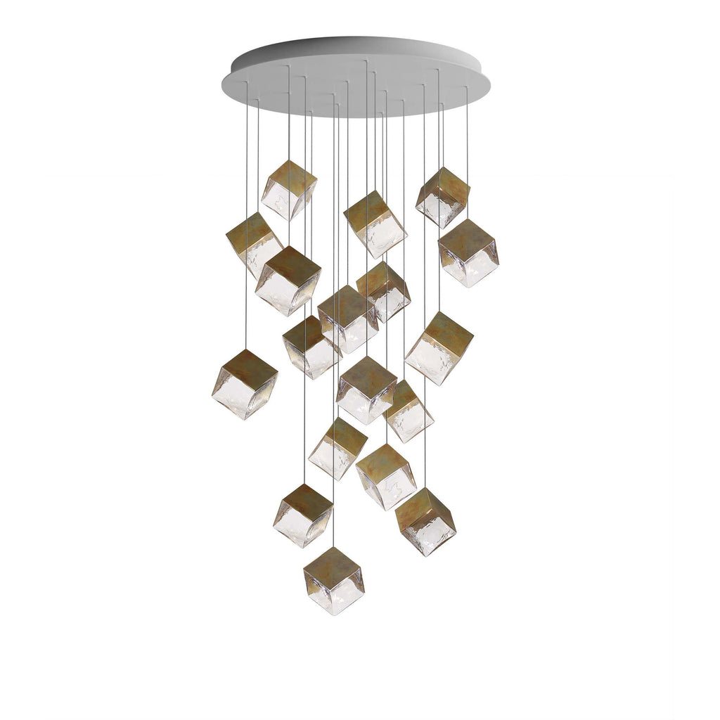 Indulge in total luxury with De Castelli x Pyrite Round Chandelier from Bomma. Featuring a hand-blown crystal cube encased in a DeOpale brass element, the golden firestone is transformed into an exquisite brass fitting with manual oxidation, creating vibrant and iridescent tones. Available in small and large sizes, this chandelier is the perfect statement maker for any entryway, dining room, or living space.