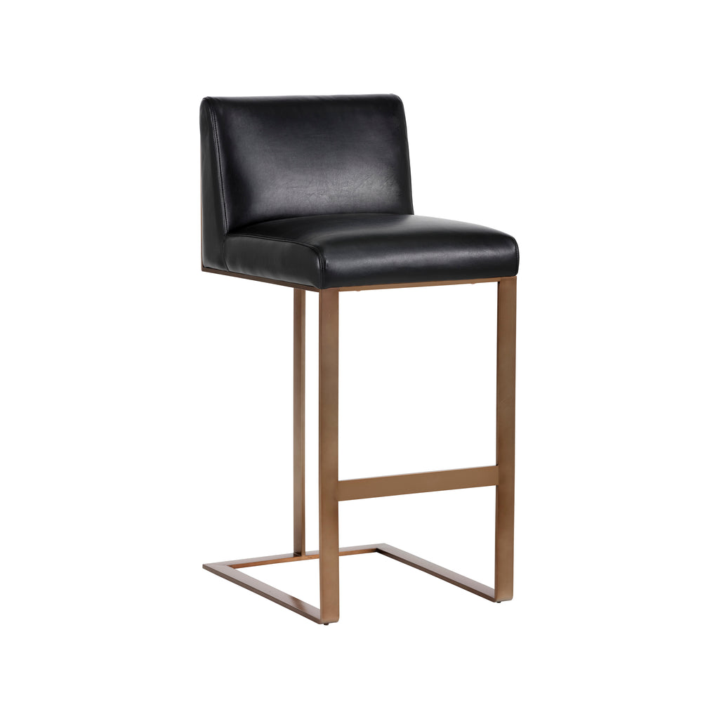 The Dean Barstool from Sunpan exudes sophistication and elegance from all angles. Its exposed brushed antique brass steel frame with a footrest adds a touch of luxury. The sleek cantina black bonded leather seat complements any space, making it perfect for restaurants, bars, and residential areas. Crafted with bonded leather, this exclusive design showcases natural leather characteristics for a one-of-a-kind piece.