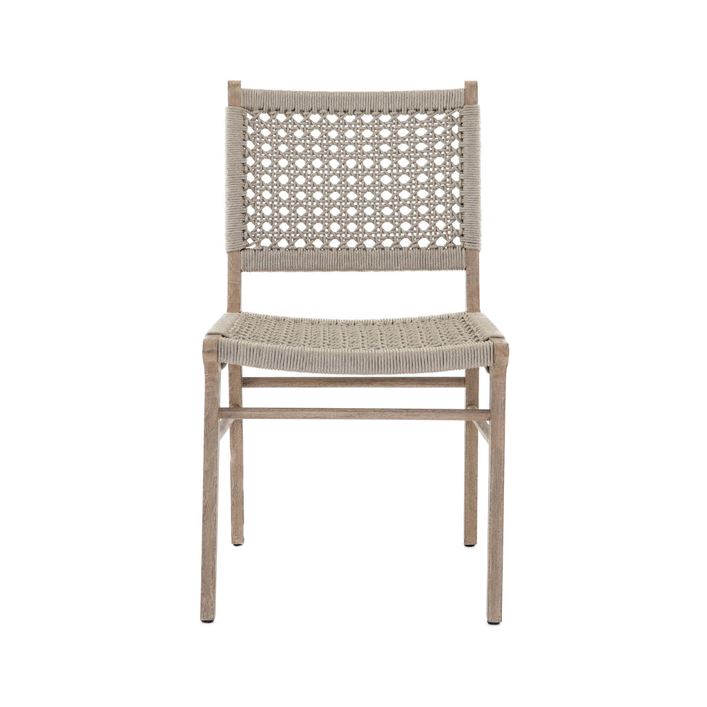 The Delmar Outdoor Dining Chair from Four Hands combines style and functionality for any outdoor space. The washed brown teak frames and woven ivory rope add a touch of texture and sophistication. With a weatherproof cover available, this chair is perfect for any occasion.