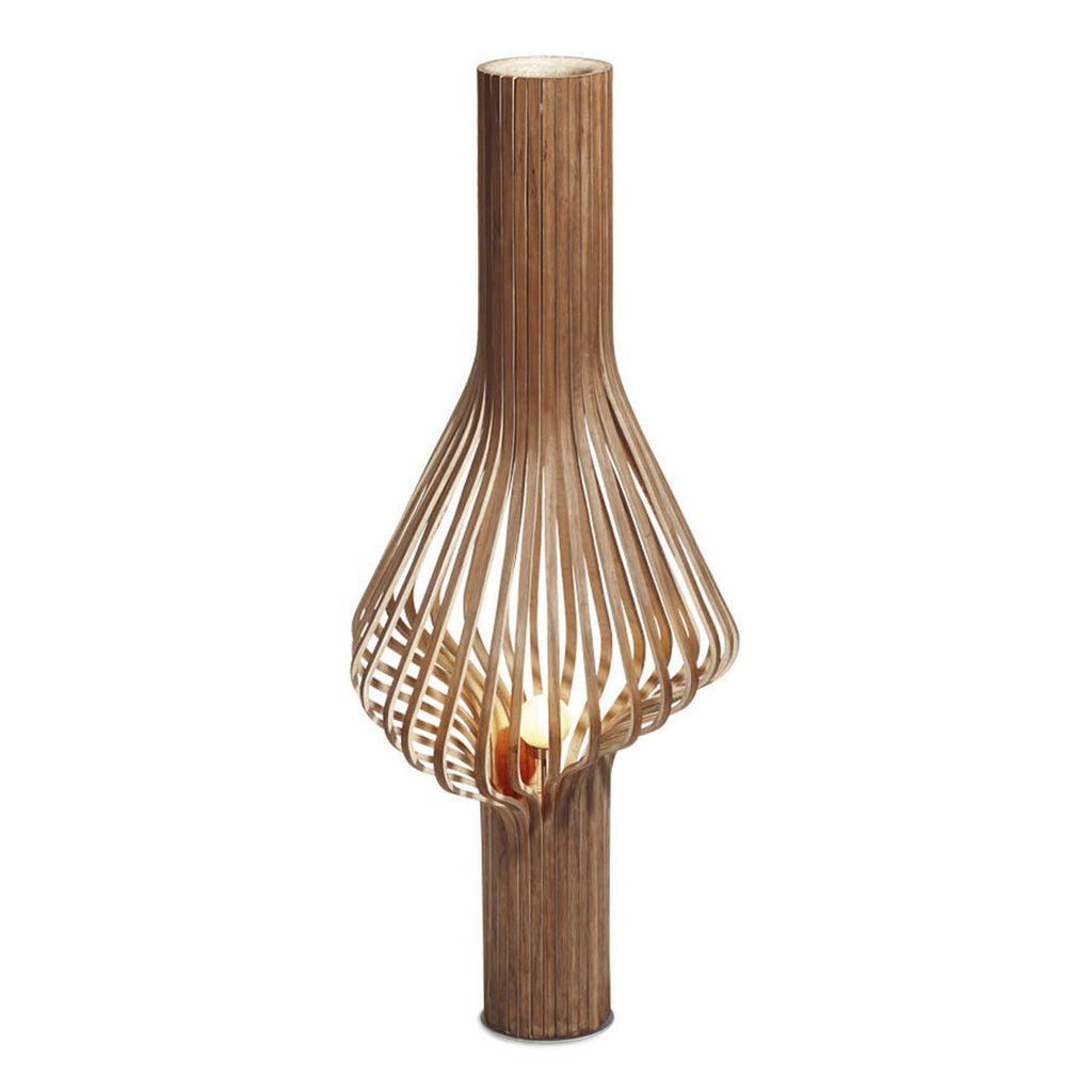 As if merrily dancing upon a polished steel plate, the Diva floor lamp, designed by Peter Natedal and Thomas Kalvatn Egset for Northern, lives up to her name given her larger-than-life personality. Made of bent plywood in laminated oak or walnut, its spiraling midriff morphs into two distinctive versions of itself from different vantage points. The inner stem supports a mouth-blown glass globe with a frosted surface that softens the light. Also available in a pendant, the Diva is handmade of 32 individual strips of wood with the tools and techniques of traditional Norwegian laminated wood craftsmanship.