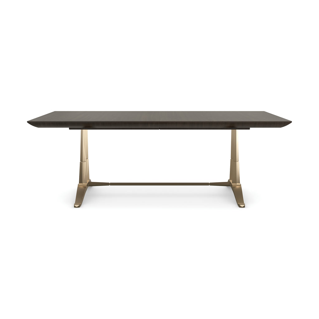 A stunning centerpiece dually inspired by architecture and fashion, the D'Orsay Extendable Dining Table from Caracole is a masterpiece of modern design. This beautiful table recalls the vaulted ceilings of the Musée d'Orsay with its gracefully arched metal frame, finished in a soft Champagne Gold. The expansive tabletop provides a warm contrast, showcasing richly grained tupelo veneers in a deep Otter finish. For ultimate versatility, the table includes a 24-inch leaf, making it a perfect and elegant stage for both intimate dinners and impromptu parties with surprise guests.