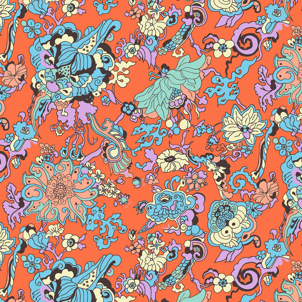 Inspired by tattoo art and 1970’s fabric, Dragon Flowers was born. This psychedelic combination of imaginative shapes, flowers, and creatures was hand drawn and painted with gouache.