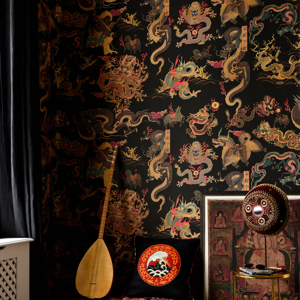 This stunning Asian style wallpaper is depicting several hand colored dragons and monsters inspired by the famous Tibetan murals and tapestries. This design is created on 3 rolls for maximizing the pattern repetition. The design is printed over 3 panels.