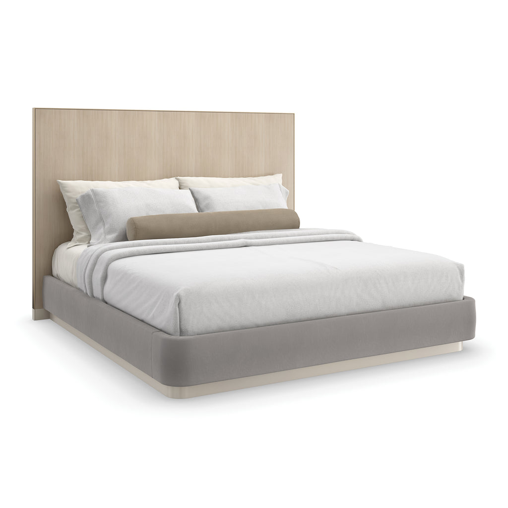 The Dream Chaser Bed from Caracole is the perfect balance of luxury and minimalism. With its Dry Martini finish and Brushed Gold accents, it exudes sophistication for a stylish sleep space. The plush mohair fabric adds a touch of comfort, while the floating footboard and side rails give it a modern, ethereal feel. Optional curved wood-paneled wings elevate its commanding presence.