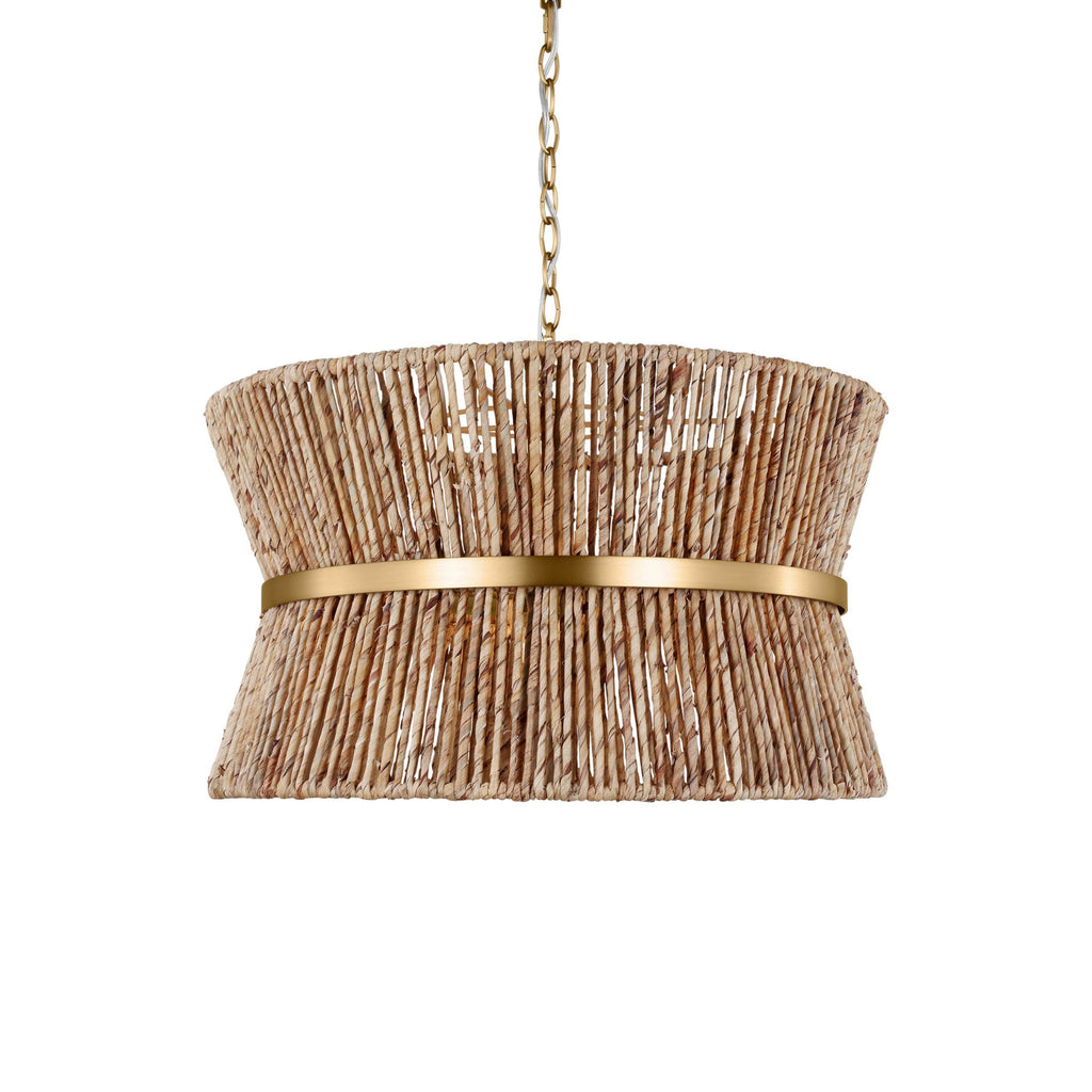 The Drew and Jonathan Thurlo Pendant Light from Visual Comfort Studio brings intricate bohemian style to your ceilings. Suspended from a clean circular canopy by a delicate chain, its hourglass-shaped shade features vertically arranged paper rope strands held by a horizontal metal hoop that angles them inward. This design diffuses warm ambient light alongside focused downlighting, creating a sophisticated blend of texture and illumination perfect for adding character to any space.