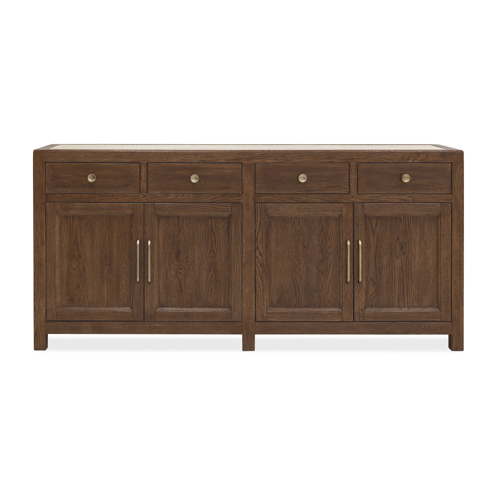 A stunning centerpiece for a rustic yet refined dining space, the Driftwood Buffet from Hooker Furniture beautifully blends natural textures. Its distressed, sun-faded finish highlights the wood's character. The design is elevated by a durable inset stone top, adding an element of organic luxury. Behind four soft-close doors and within four self-closing drawers, adjustable shelving and a silverware tray provide ample, organized storage for all your dining essentials.