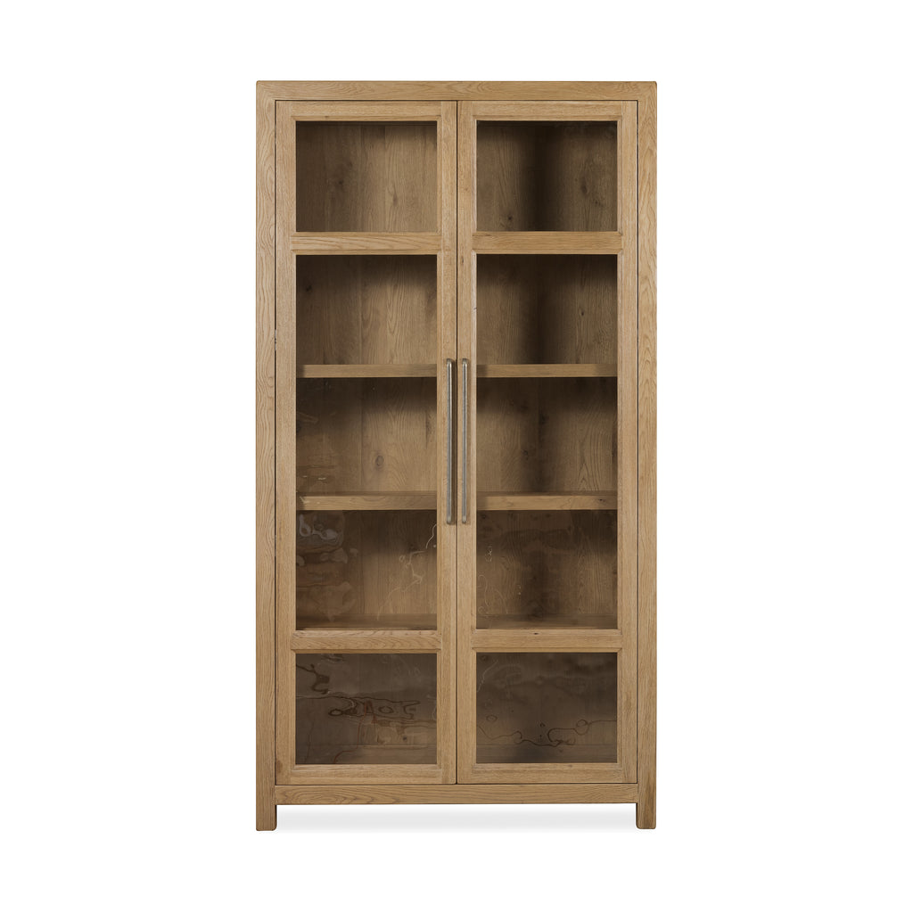 Bringing rustic warmth and vintage charm to your dining space, the Driftwood Display Cabinet from Hooker Furniture is a beautiful blend of texture and character. This tall, elegant cabinet is crafted from oak solids and veneers, with a distressed finish that celebrates the wood's authentic knots. The two doors feature wood frames and seeded glass panels, adding a touch of old-world charm while allowing a glimpse of the treasures within. Inside, four adjustable shelves provide the perfect stage for showcasing your favorite collectibles or dishware.