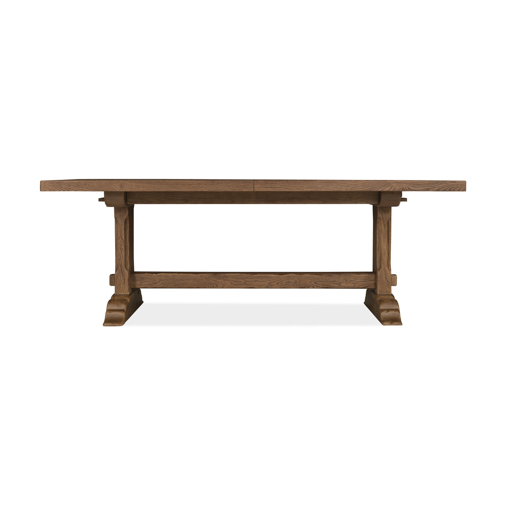 A grand centerpiece for family feasts and friendly gatherings, the Driftwood Rectangle Extendable Dining Table from Hooker Furniture embodies a relaxed, farmhouse charm. Crafted from oak solids and veneers, its distressed finish celebrates the wood's natural character with authentic knots and texture. The table rests on a sturdy double pedestal base with a distinctive interlocking stretcher. With two 20-inch leaves, it easily extends to an impressive 126 inches, welcoming everyone to a table built for making memories.