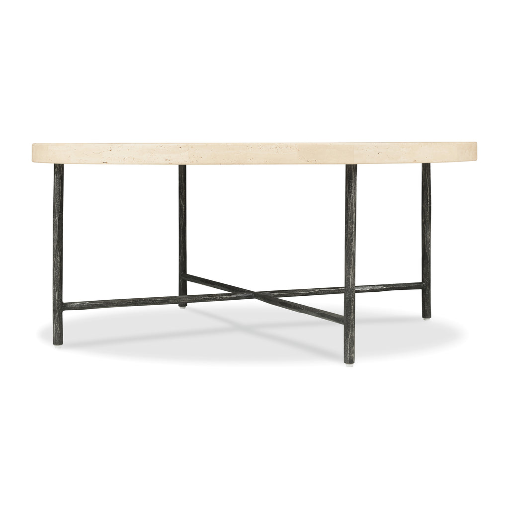 A masterful blend of natural stone and industrial texture, the Driftwood Round Cocktail Table from Hooker Furniture brings a striking, elegant look to your living space. This versatile centerpiece features a durable round stone top, offering a touch of organic beauty and natural variation. The top is supported by a sturdy, textured metal base with a distinctive X-stretcher design, providing a modern, industrial flair. A fusion of refined materials and strong, simple form, it’s a sophisticated and functional focal point for any room.
