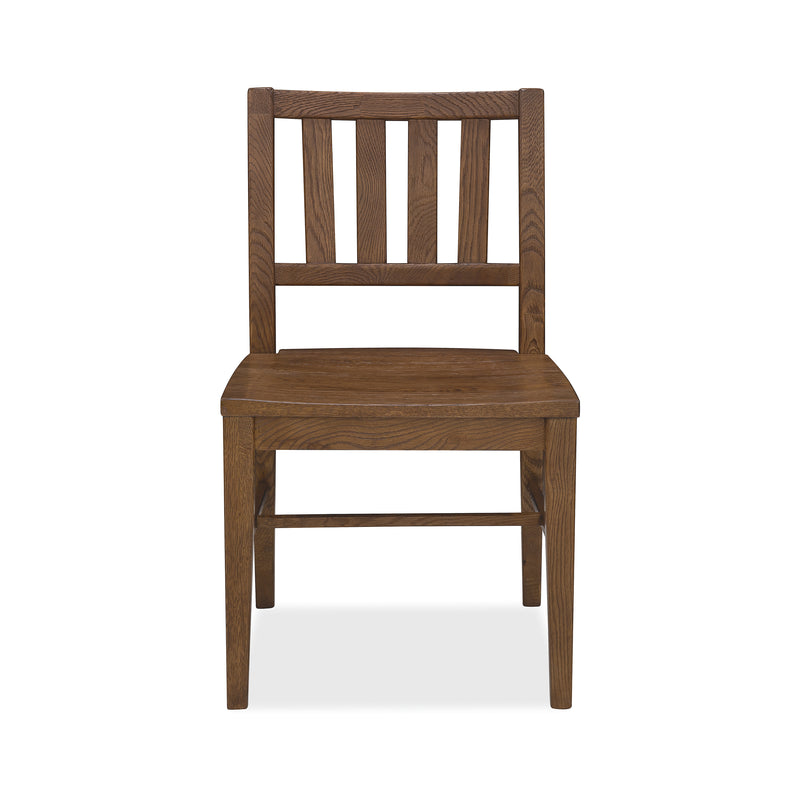 Embodying classic farmhouse character, the Driftwood Splatback Side Chair from Hooker Furniture brings a sense of rustic warmth to the dining room. This sturdy chair is crafted entirely from solid oak, with a distressed, timeworn finish that adds a touch of heritage charm. The timeless slat-back design and solid wood seat create a simple, honest silhouette that is both comfortable and durable. With its versatile, armless profile, it tucks neatly under any table, making it a perfect choice for cozy dining spaces.