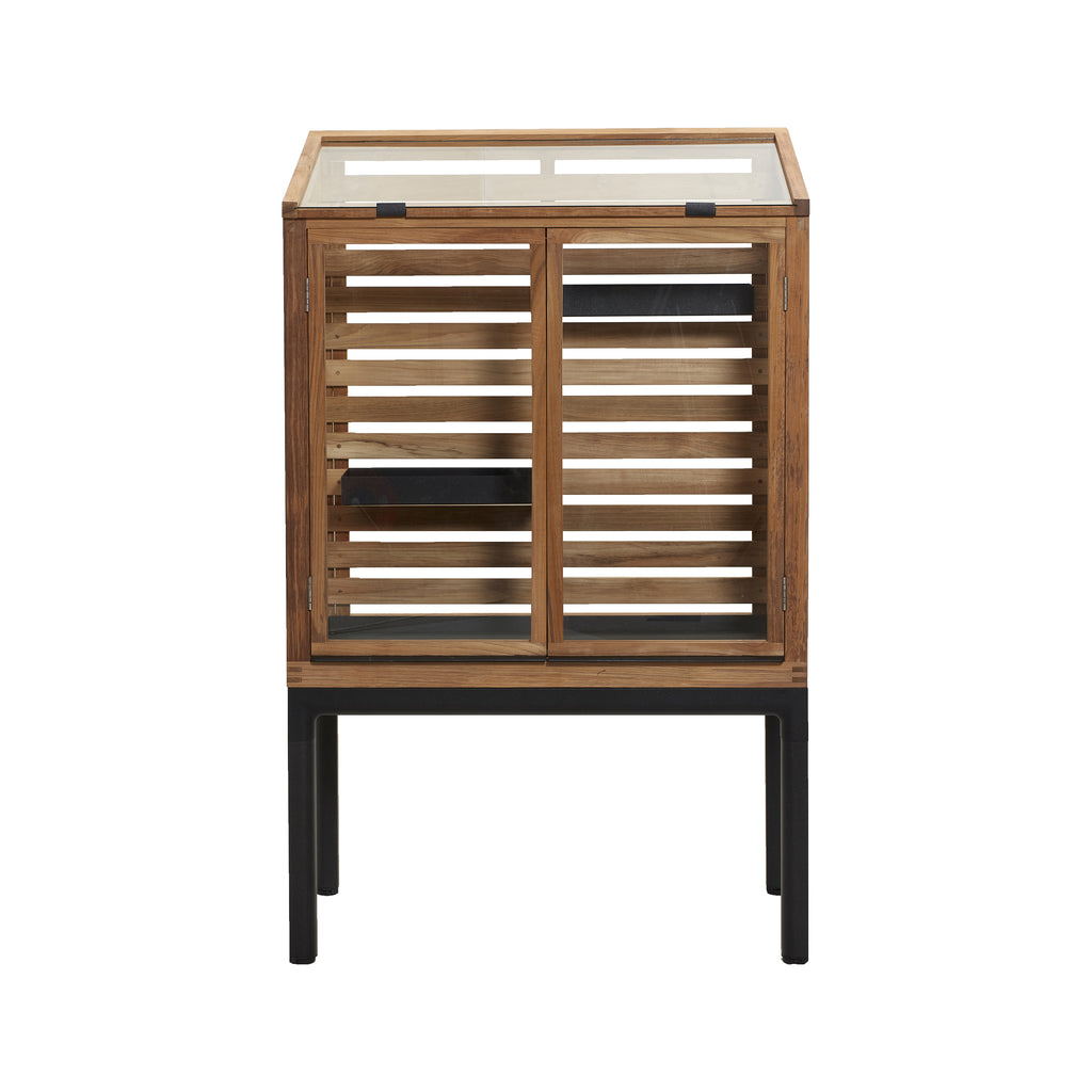 The Drop greenhouse is designed by Cane-line Design, and is part of the Drop collection, which consists of an outdoor kitchen concept and a selection of outdoor dining tables. The greenhouse is made with a frame in warm teak with glass panes and two doors, so you can easily organize your favorite herbs and vegetables. Cane-line teak is approved and cultivated according to SVLK certification system. With the Drop Greenhouse, you get two practical movable shelves where your greens can be placed. The top of the greenhouse is easily clamped open to create air circulation for your plants, ensuring optimal growth conditions.