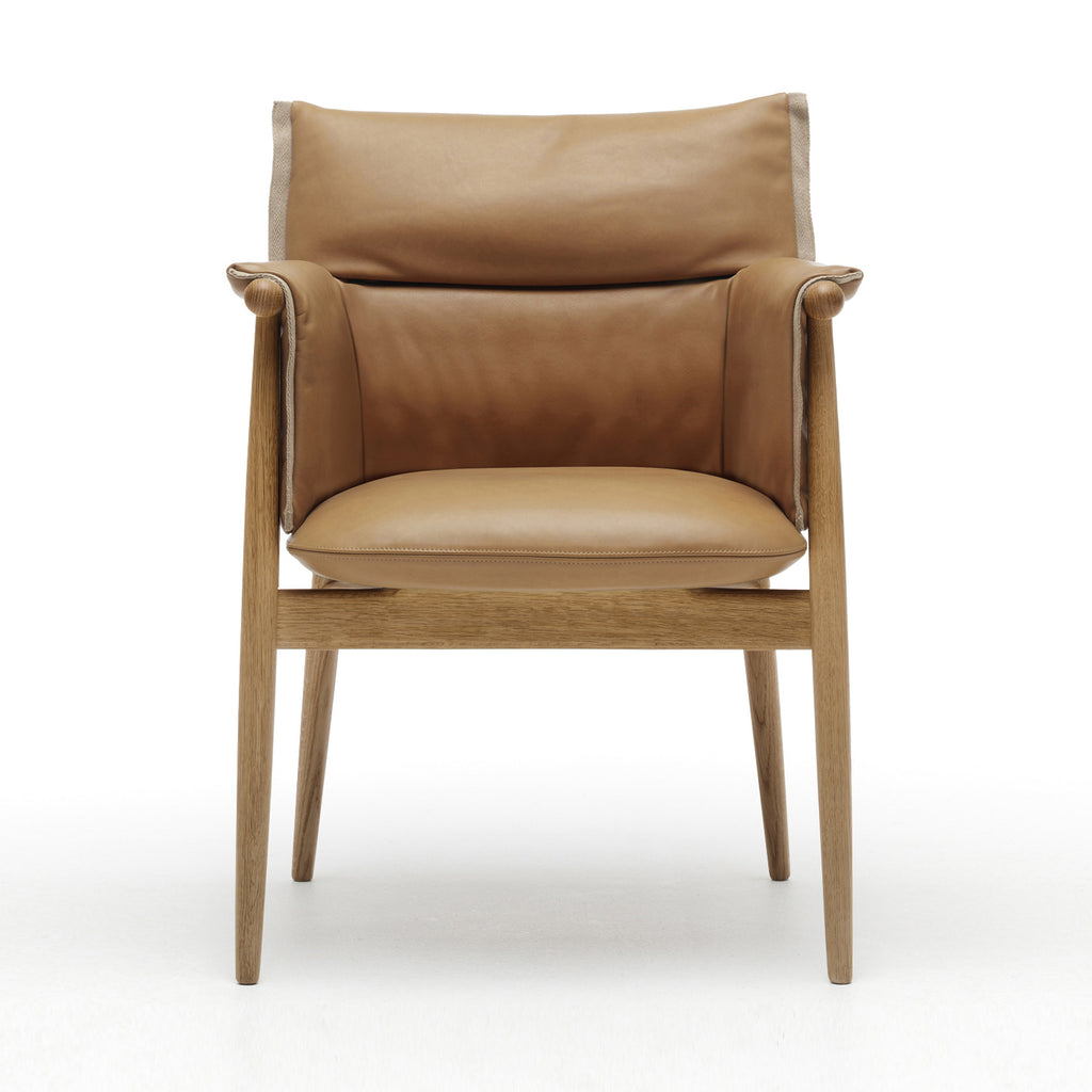 The E005 Embrace Armchair from Carl Hansen and Son balances rigorous craftsmanship with a relaxed, casual attitude. Designed by the Austrian studio EOOS, the chair is defined by its exposed solid wood frame, which is not hidden by upholstery but rather celebrated as the primary architectural element. The structure features legs that extend seamlessly into the backrest, connected by precise finger joinery that showcases skilled woodworking. Nestled within this sturdy skeleton is a soft, folded cushion that acts as the seat, back, and armrests all in one. This floating" upholstery design offers superior comfort while keeping the beautiful wooden framework visible from every angle.