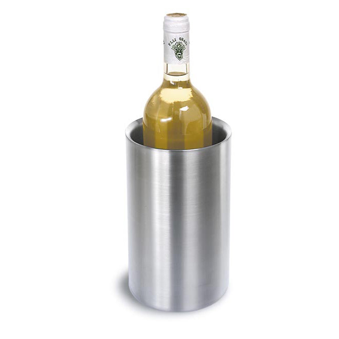Blomus stainless steel bottle cooler is double walled to maintain cool wine temperature.