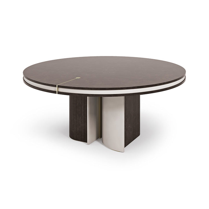 The Eclipse Round Dining Table, conceived by designer Andrea Bonini for Turri’s avant-garde Eclipse collection, is a study in graceful contrasts—its glossy lacquered wooden structure is rhythmically punctuated by leather inserts and signature grooves that echo the collection’s sculptural motif. The hand-decorated, high-gloss top and base are meticulously finished, while accents in light-gold metal elevate its sophisticated allure. From a sky-high city loft to a sprawling contemporary home, this spacious dining table is the perfect anchoring centerpiece.