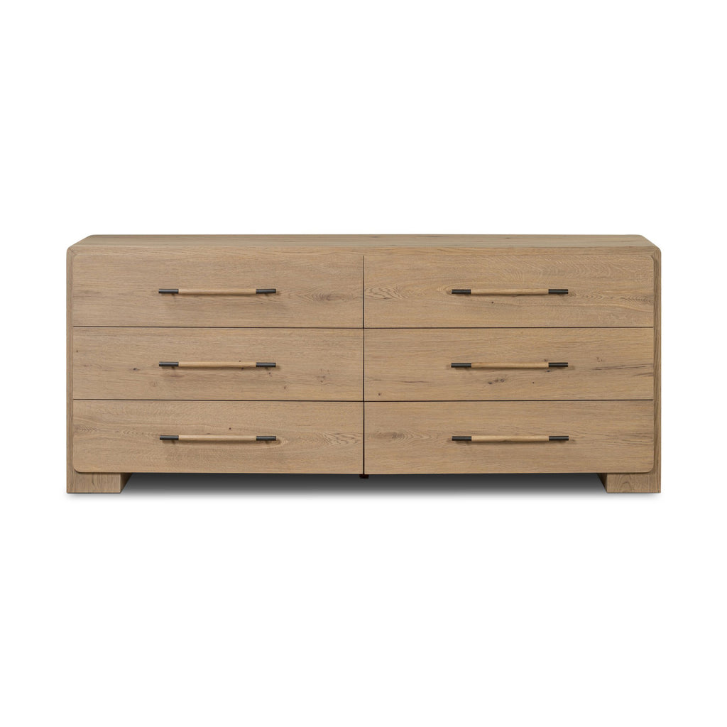 A simple and spacious solution for bedroom storage, the Eden 6-Drawer Dresser from Four Hands features a clean, modern aesthetic. This beautiful oak piece is defined by its elegant waterfall silhouette, where the top and sides flow together in a continuous line. Six spacious drawers offer an exceptional amount of organized storage, finished with a unique mix of aged bronze and wood hardware. A sophisticated and practical centerpiece, it brings a sense of calm, uncluttered style to any bedroom.