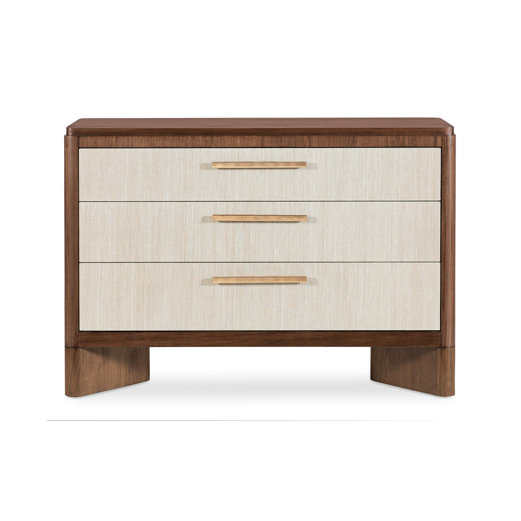 A beautiful study in textural contrast, the Eleana 3-Drawer Chest from Hooker Furniture is a refined and sophisticated storage piece. This elegant chest is crafted from rich walnut veneers in a light caramel finish, with soft, rounded corners for a graceful silhouette. The three spacious, self-closing drawers are accented with a warm, beige-toned grass-cloth front, adding a touch of natural, organic texture. Finished with plated Sunlit Bronze hardware, it’s a stunning and versatile addition to any bedroom, hallway, or living room.