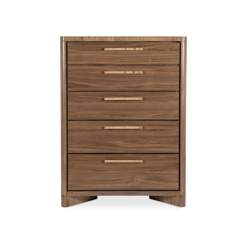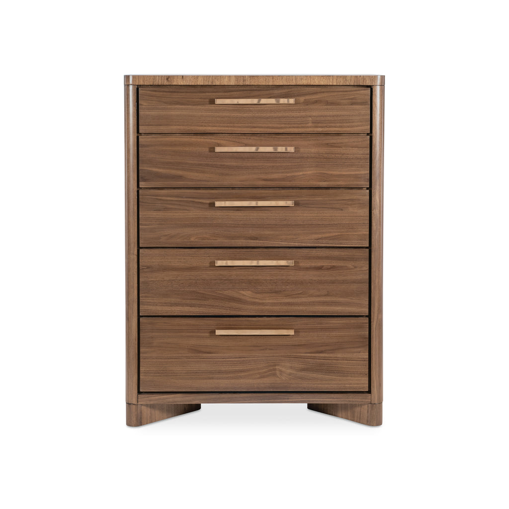 A statement of timeless sophistication, the Eleana 5-Drawer Dresser from Hooker Furniture brings elegant, vertical storage to the modern bedroom. This beautiful chest is crafted from rich walnut veneers in a light caramel finish, with soft, rounded corners that enhance its graceful, sculptural silhouette. Five spacious, self-closing drawers provide ample storage, with the thoughtful detail of a cedar-lined bottom drawer. It’s a stunning and practical centerpiece for any transitional bedroom.