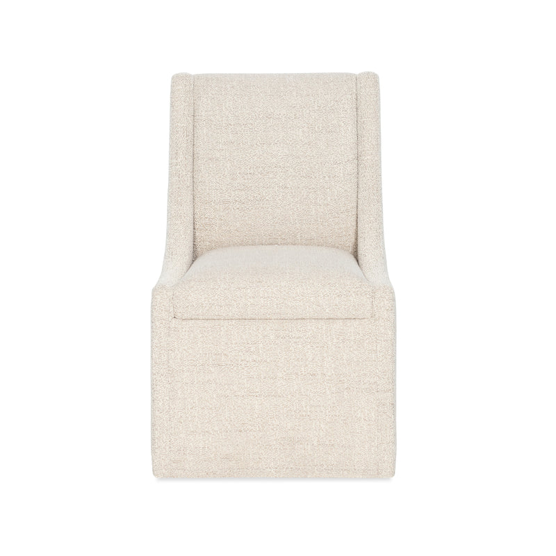 A versatile and elegant seating solution, the Eleana Castered Side Chair from Hooker Furniture brings both comfort and convenience to your home. This beautiful chair is fully upholstered in a durable and soft beige fabric blend, with low, sloped track arms for a touch of modern sophistication. The luxurious padded seat provides an inviting sit, while smooth-rolling casters offer effortless movement. Perfect for a multi-purpose dining area, game table, or home office, it’s a stylish and highly functional addition to any space.