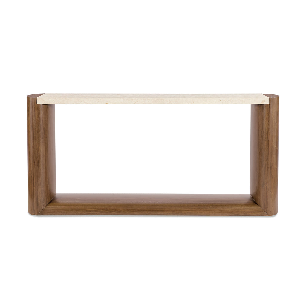 An elegant focal point for an entryway or living room, the Eleana Console Table from Hooker Furniture is a stunning blend of luxurious materials. This beautiful table is defined by its chic, honed marble top, which features beautiful white and beige coloring. The top is supported by a graceful frame crafted from rich walnut veneers in a light caramel finish. With its long, slender silhouette, this piece is perfect for placing behind a sofa or along a wall, bringing a touch of modern luxury and timeless style to your home.