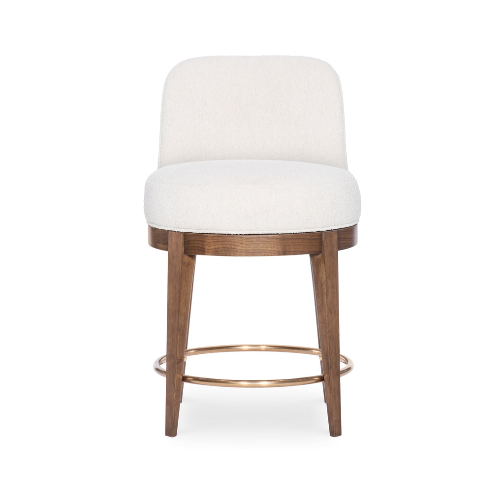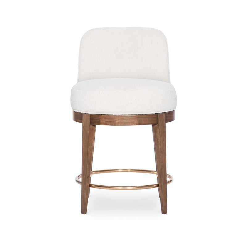 A perfect blend of sophisticated style and everyday comfort, the Eleana Counter Stool from Hooker Furniture is a luxurious addition to any kitchen or bar area. This beautiful stool is crafted from rich walnut veneers in a light caramel finish, with a rounded barrel back that offers an inviting, comfortable sit. For ultimate function, it features a 180-degree return memory swivel, allowing for easy conversation and a consistently neat look. The circular metal footrest in a sunlit bronze finish adds a final touch of modern elegance.