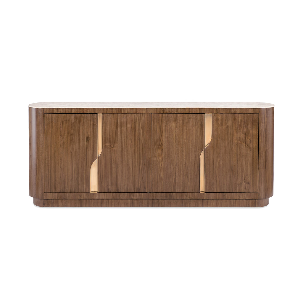A stunning statement of modern luxury, the Eleana Credenza from Hooker Furniture is a perfect fusion of form and function. This beautiful credenza is crafted from rich walnut veneers and features a luxurious, honed marble top for a refined contrast of materials. The elegant silhouette is defined by soft, rounded sides and a contemporary plinth base, with plated Sunlit Bronze hardware adding a final touch of sophistication. Behind the four soft-close doors lies a highly organized interior, complete with adjustable shelving and self-closing drawers, making it a perfect piece for any dining or living space.