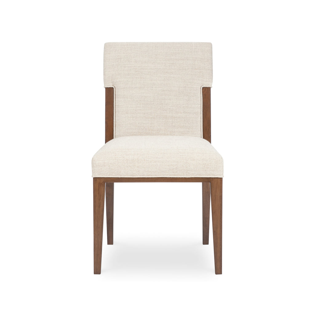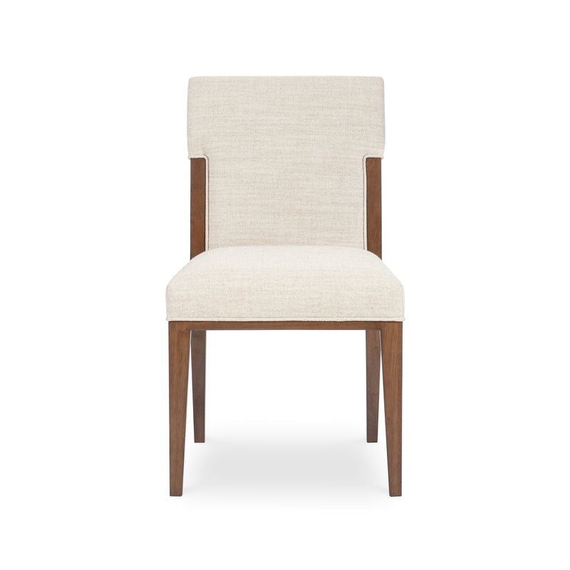 A timeless and elegant addition to any dining room, the Eleana Dining Chair from Hooker Furniture offers a sophisticated seating experience. This beautiful side chair is crafted with a solid wood frame in a light caramel walnut veneer finish, showcasing the natural beauty of the wood grain. The comfortable seat and back are fully upholstered in a durable and soft beige fabric blend, with refined welt trim for a tailored look. Supported by graceful, tapered wood legs, its sleek, armless silhouette brings a touch of classic comfort and enduring style to your dining table.