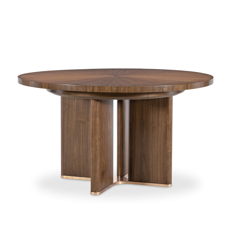 A stunning centerpiece that adapts to your entertaining needs, the Eleana Round Extendable Dining Table from Hooker Furniture combines sculptural elegance with versatile function. This beautiful table is defined by its top, which features a sophisticated starburst veneer pattern. The table easily extends with the addition of a leaf, making it perfect for intimate dinners or larger gatherings. The top rests on a sculptural pedestal base of plated Sunlit Bronze metal, creating a harmonious blend of warm wood and cool metallic tones.