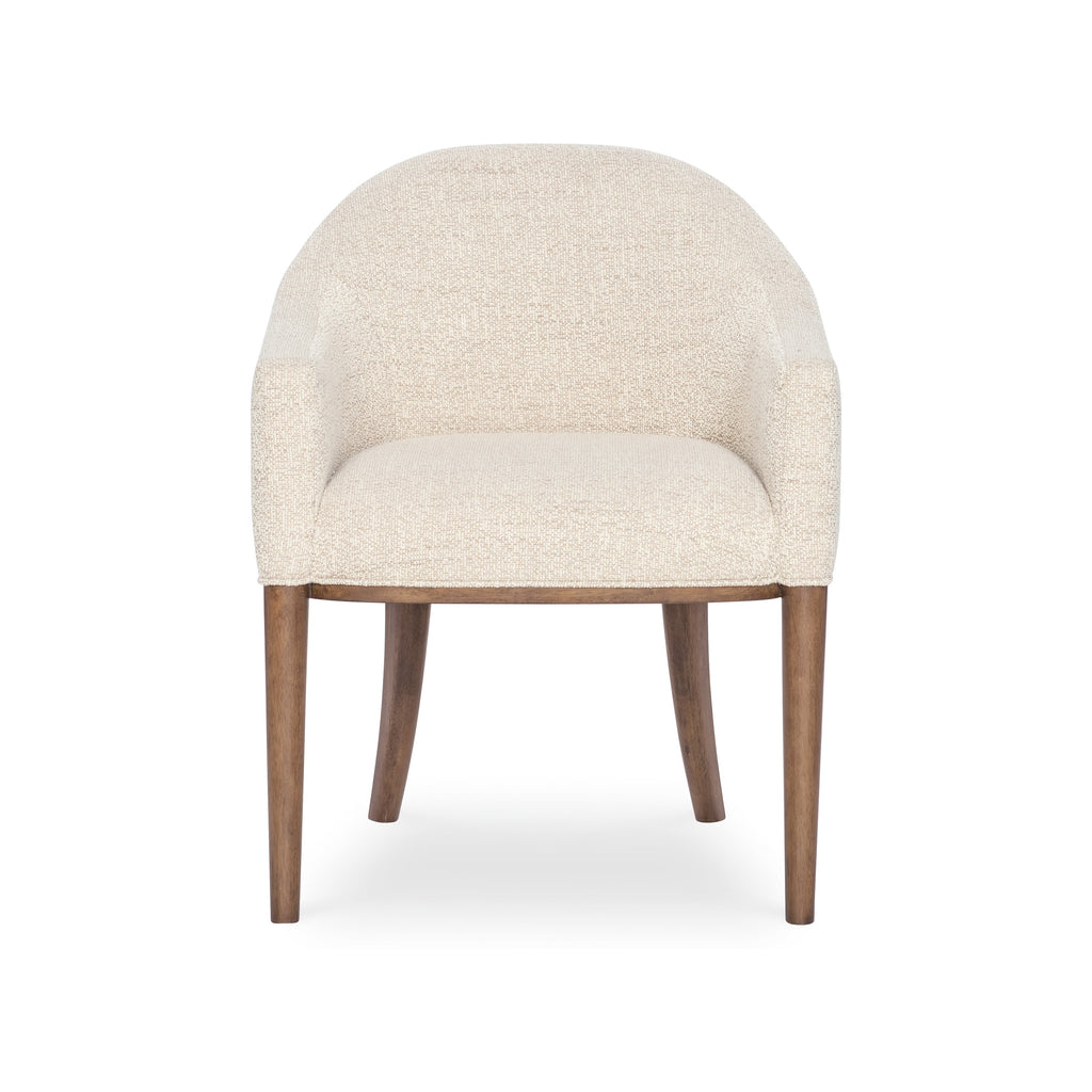 A timeless and elegant addition to any dining room, the Eleana Upholstered Dining Armchair from Hooker Furniture offers a sophisticated seating experience. This beautiful armchair is crafted with a solid wood frame in a light caramel walnut veneer finish, showcasing the natural beauty of the wood grain. The comfortable seat and back are fully upholstered in a durable and soft beige fabric blend, with refined welt trim for a tailored look. Supported by graceful, tapered wood legs, it brings a touch of classic comfort and enduring style to your dining table.