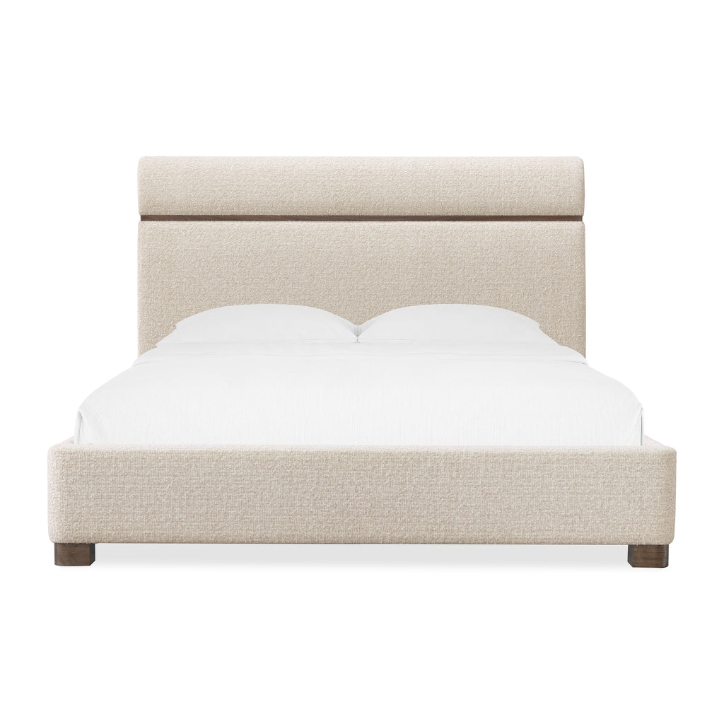 A serene and inviting centerpiece for the modern bedroom, the Eleana Upholstered Panel Bed from Hooker Furniture is a stunning fusion of soft textures and warm wood. This beautiful bed features a comfortable, upholstered panel headboard and footboard, framed by rich walnut veneers in a light caramel finish. The design is grounded by soft, rounded block feet, enhancing its gentle, curved silhouette. A perfect blend of comfort and sophisticated style, it creates a tranquil and luxurious foundation for any bedroom.