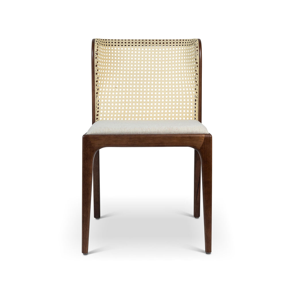 Embrace modern luxury with the sleek silhouette of the Eloa Cane Side Chair from Urbia. Crafted with a solid Tauari wood frame, this chair seamlessly combines strength and style. The upholstered seat and curved natural cane back exude sophistication and organic charm. Versatile and comfortable, it's perfect for dining or occasional use. Elevate your space with its sensual allure and superior craftsmanship.