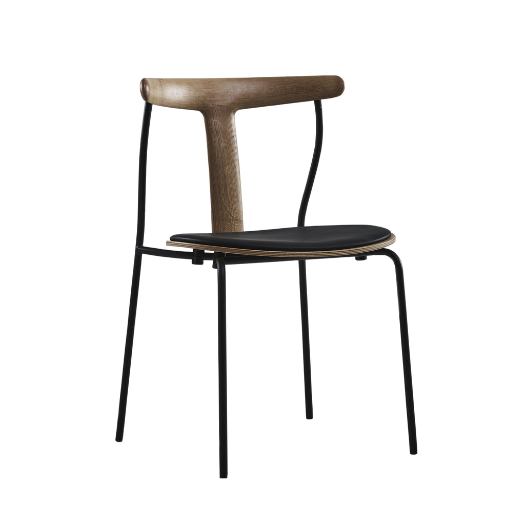 Era is an innovative chair with a modern material mix. It was showcased at the Association of Applied Arts´ autumn exhibition in the mid 1950´s. Sven Ivar Dysthe’s prototype in steel, wood and leather was honoured in the Norwegian magazine Bonytt as the exhibition´s most interesting product. Dysthe graduated from the Royal College of Art in 1954. He designed Era with organic wood and industrial steel, resulting in a versatile chair suited to a range of styles and settings. The black powder coated steel frame, a steam bent T-shaped wooden backrest, together with a light and almost floating veneer seat, provide an elegant design and comfortable form. With its stackable ability it has a perfect combination of aesthetics and pure function.