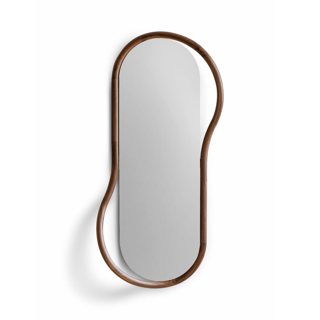 Enhance your modern interior with the Escultura Unut Oval Wall Mirror from Nomon. The sinuous shape of the design, inspired by an Egyptian Goddess, adds a unique touch to any room. Handcrafted in Barcelona, Spain, this solid walnut wood mirror is perfect for entryways, bathrooms, and dressing rooms.