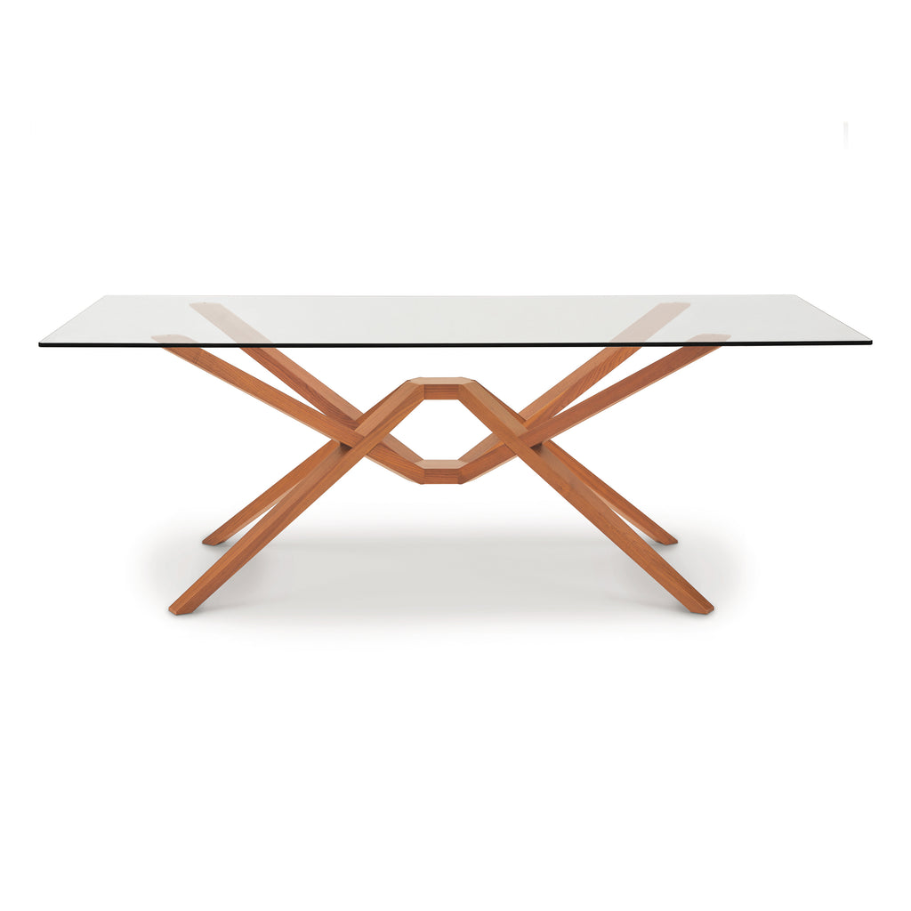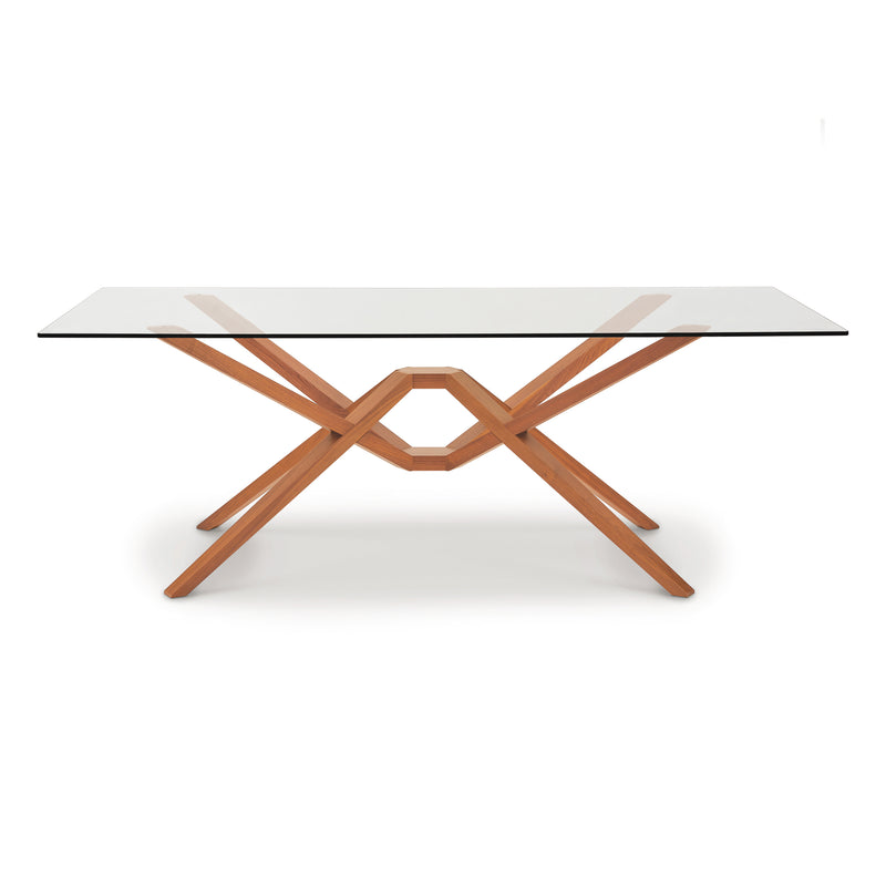 Exeter dining is a striking marriage of isometric tension and modern design. Glass top tables in a variety of sizes and shapes showcase the base. The Exeter Dining Room is crafted in solid cherry hardwood and Made to Order in several finishes. The Exeter Dining Room is also crafted in solid American black walnut with natural finish. Exeter Dining items are finished with a low sheen (10 sheen) top coat.