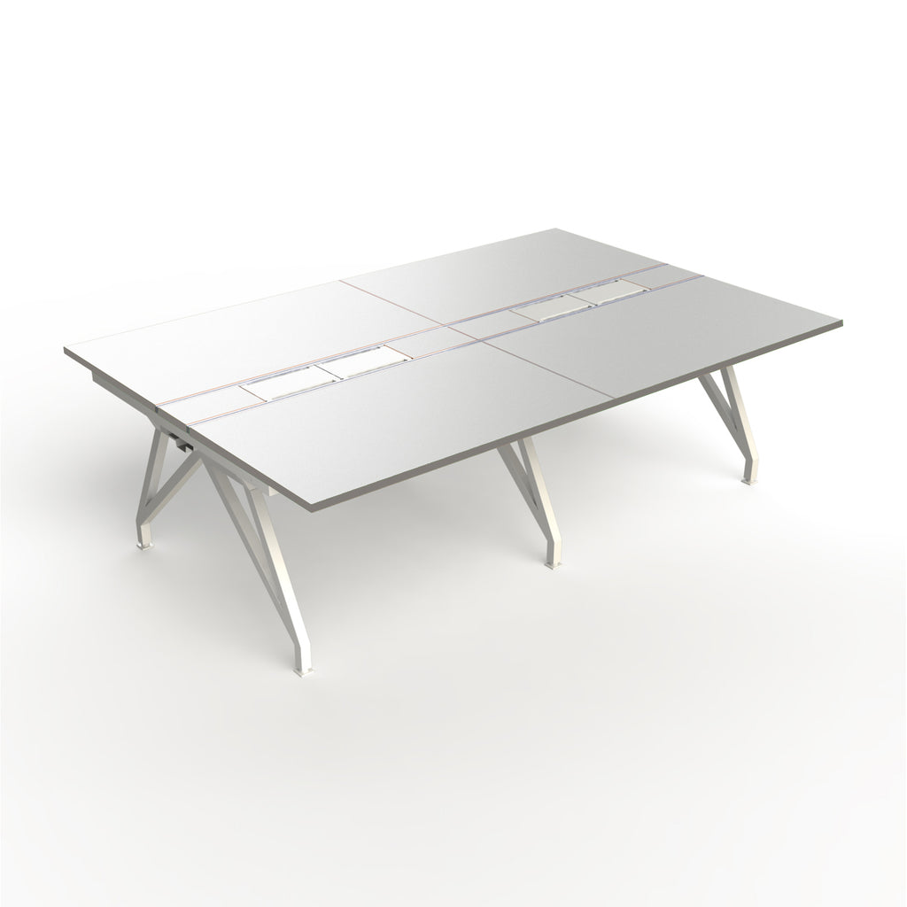 - 4 Workstations Desk System. 4 Desktops, 2 Center Modules with aluminum rails and 3 steel access panels; 1 Steel frame, 3 Legs, 1 cable trough for wire management